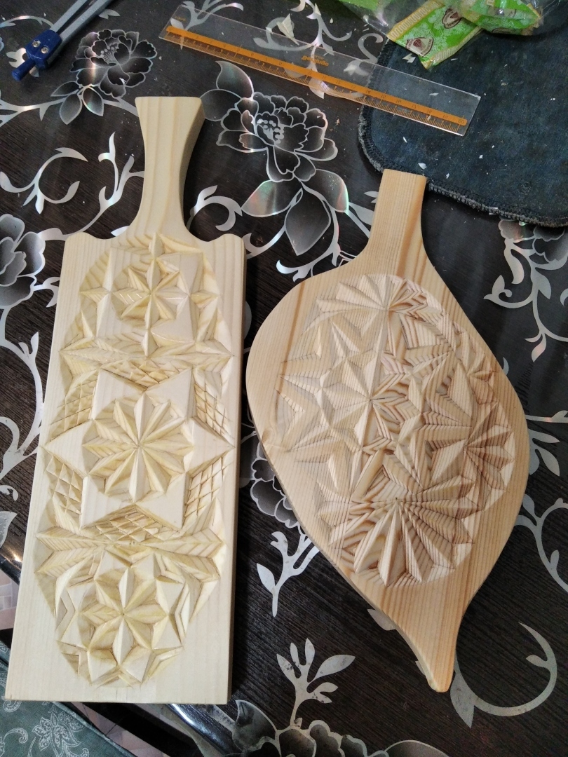 Почему выбрал геометрическую резьбу? Наверное потому что эта резьба требует минимум инструмента, всего-то нож косяк или топорик. Так же легко можно составить красивы и не сложный рисунок, а если в школе была твердая пятерка по геометрии, то вообще проблем не должно быть.