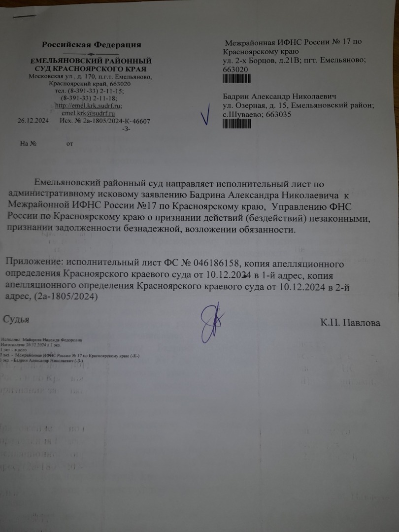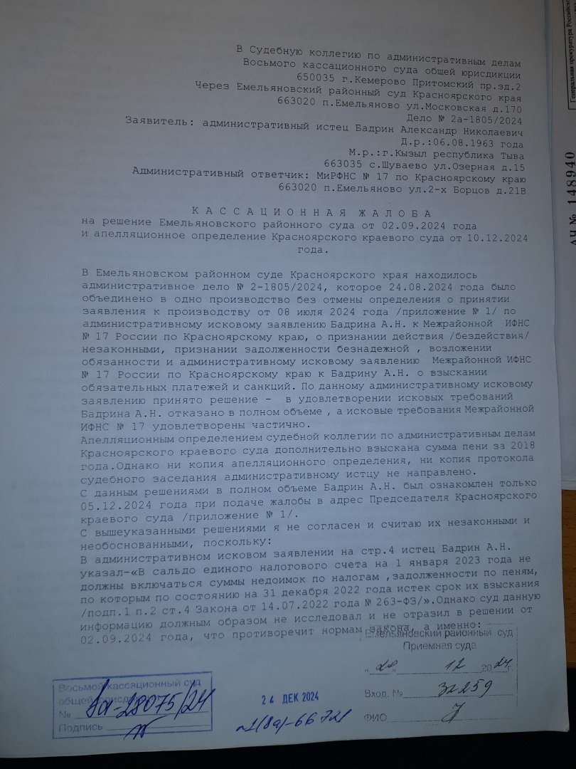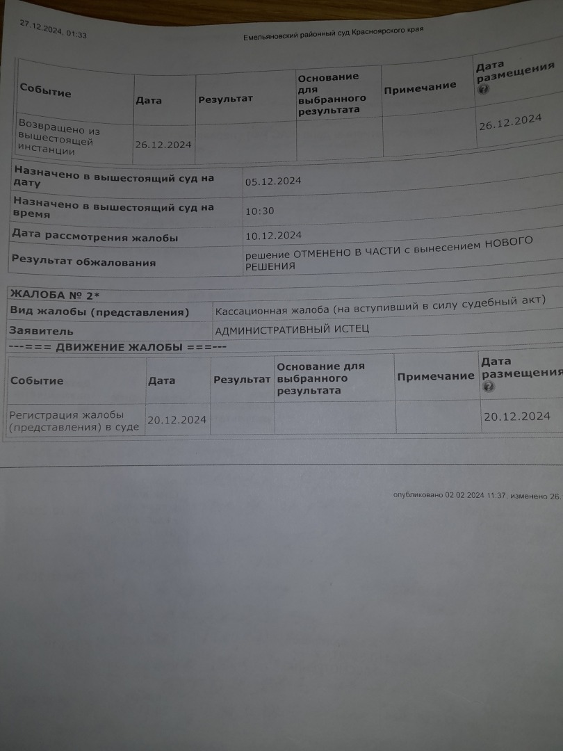 Добрый вечер.Несмотря на многочисленные отзывы о "работе" Емельяновского районного суда Красноярского края и непосредственно судьи данного судейского сообщества Павловой К.П. данная "плодотворная деятельность" продолжается.Согласно информации Гас Правосудия по делу 2а-1805/2024 в суд первой инстанции 20.12.2024 года поступила кассационная жалоба