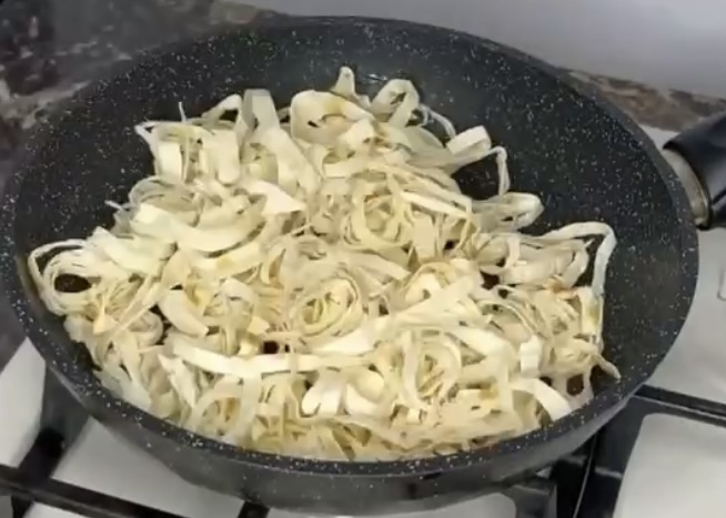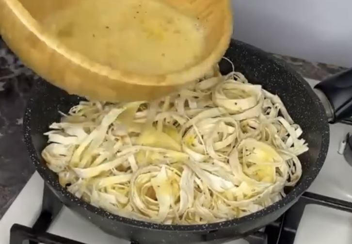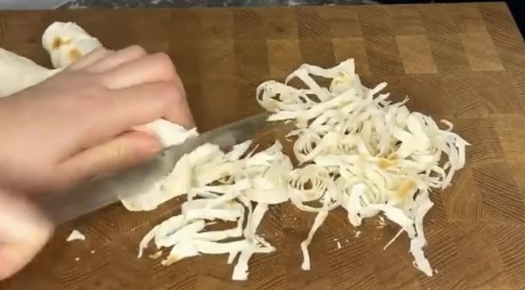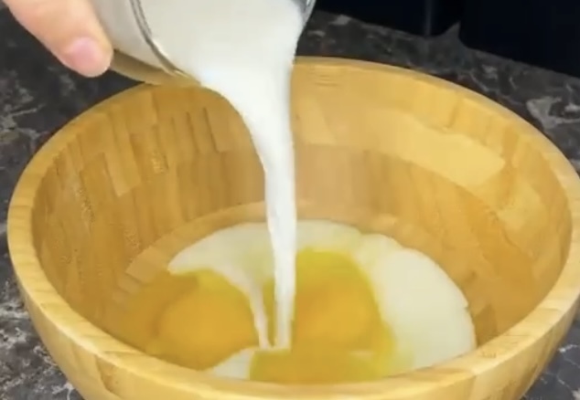 Таким способом его полностью нарезаем, после этого в глубокую миску кладем яйца, молоко, соль и перец. Тщательно все это перемешиваем: