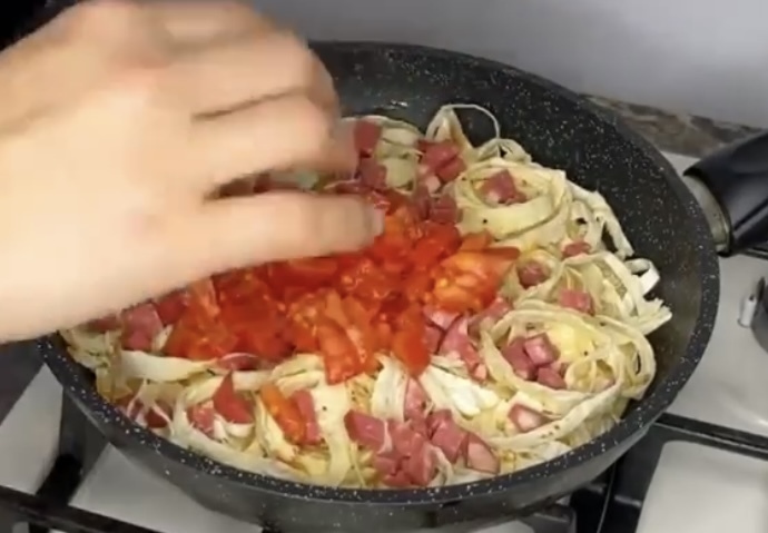 После этого, в сковородку с лавашем, также равномерно, кладем шампиньоны, ветчину, помидоры и душицу: