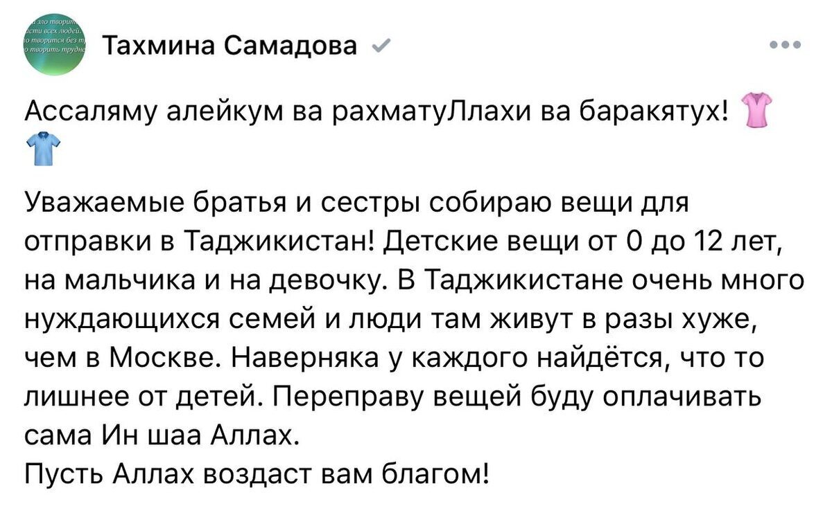 Тахмина Самадова, оказывается, активно занимается бизнесом, что, согласитесь, для семьи нуждающейся весьма странно. Что нигде не указывается у неё. А еще она занимается благотворительностью, но "только для мусульман". Вот как-то так — не совсем многонационально получается. "Отправляет какие-то товары для таджиков в Таджикистан. Пролистали её страницу, ни слова об СВО".