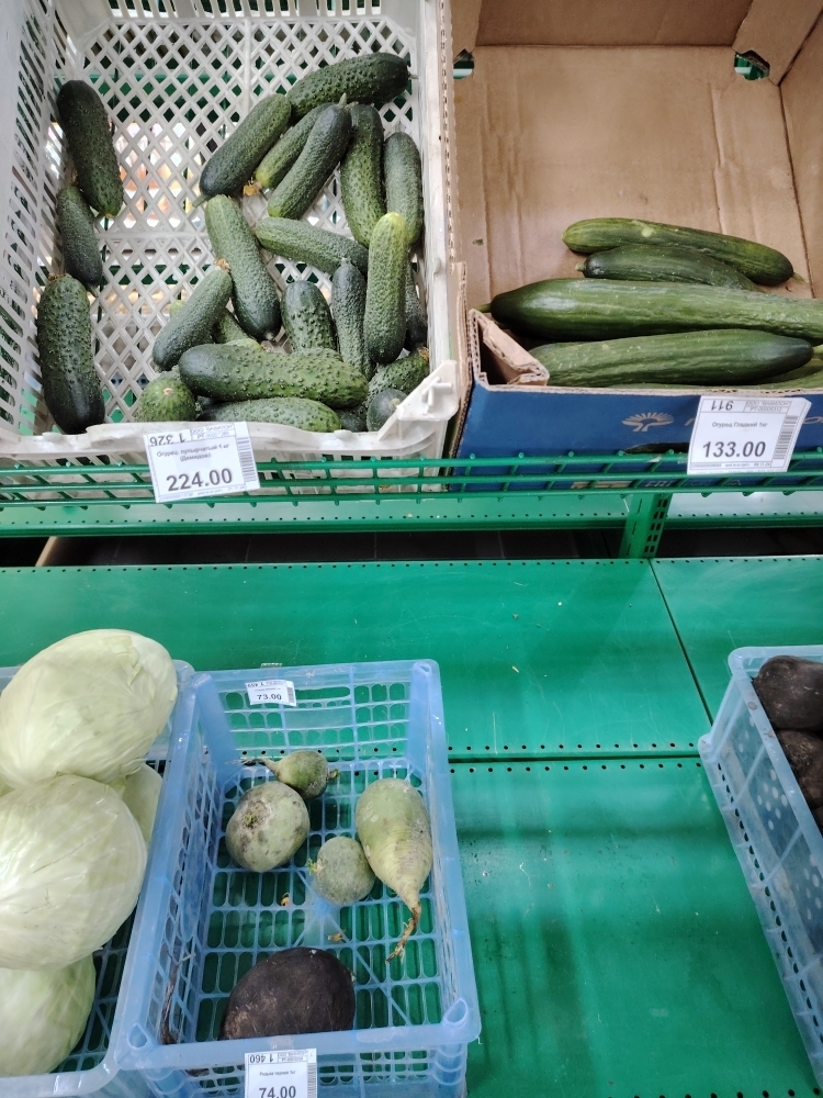 А вот огурцы и помидоры в декабре 2024 года стоили от 133 до 224 руб. Сейчас они стоя у нас 320 рублей, это при том что у нас за городом стоят огроменные теплицы, выращивают огурцы, но мы в своем городе не видим, все идет на экспорт видимо или в Москву.