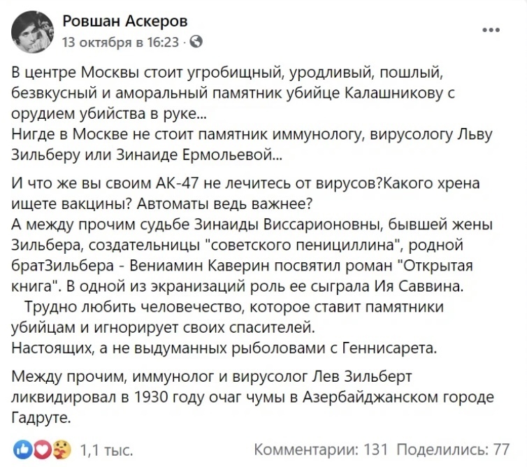 С его бессовестных уст вышли мерзкие слова в отношении установленного в Москве памятника Михаилу Калашникову.