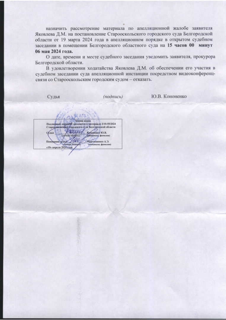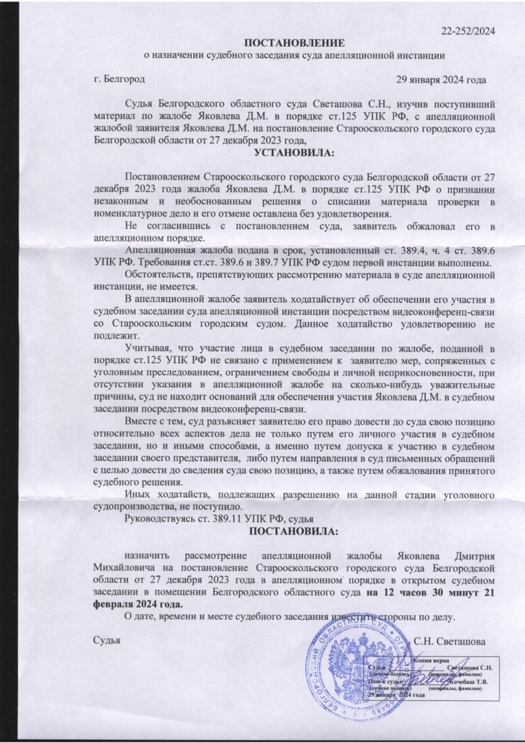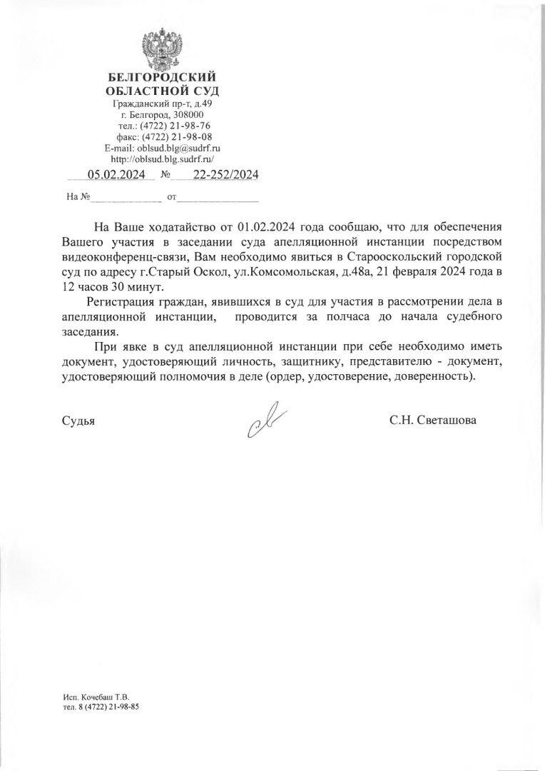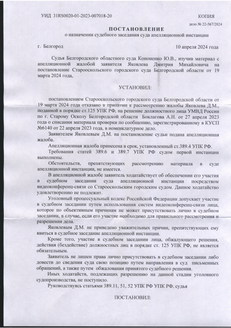 27.12.2023 Старооскольским городским судом было вынесено решение по моей жалобе. 21.02.2024 состоялось апелляционное рассмотрение жалобы в Белгородском областном суде, в котором я принял участие по видеоконференц-связи. Белгородский областной суд постановил вернуть жалобу на новое рассмотрение в суд первой инстанции для устранения нарушений. 19.03.2024 Старооскольским городским судом было отказано в судебном рассмотрении моей жалобы. Данное решение я обжаловал в Белгородский областной суд. Вместе с тем, я ходатайствовал о моём участии через Старооскольский городской суд по средством видеоконференц-связи.