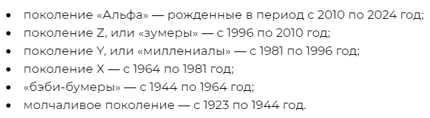 Теория поколений появилась уже давно, ещё в 1923 году её впервые сформулировал немецкий социолог Карл Маннгейм. В настоящее время существует несколько классификаций, но чаще всего можно увидеть вот такую: