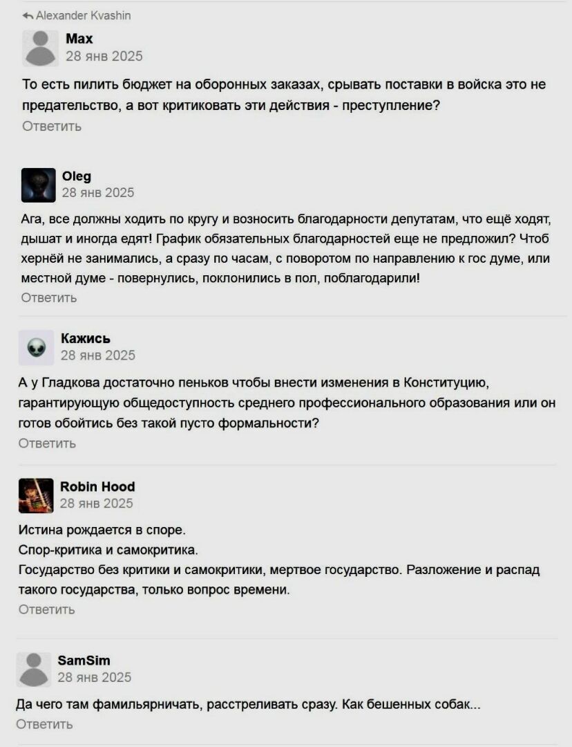 Гладков говорит о недопущении получения образования в государственных техникумах и ВУЗах несовершеннолетними, которые совершили противоправные действия . Критика власти — это не противоправные действия. У нас даже закона нет для привлечения за критику власти.