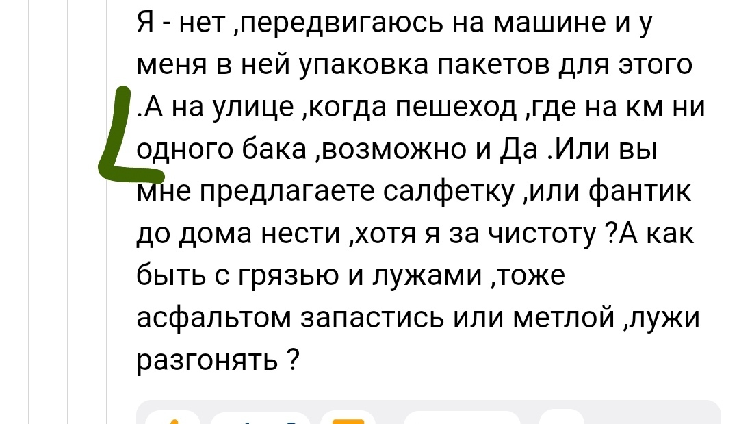 Я - нет ,передвигаюсь на машине и у меня в ней упаковка пакетов для этого .А на улице ,когда пешеход ,где на км ни одного бака ,возможно и Да .Или вы мне предлагаете салфетку ,или фантик до дома нести ,хотя я за чистоту ?А как быть с грязью и лужами ,тоже асфальтом запастись или метлой ,лужи разгонять ?