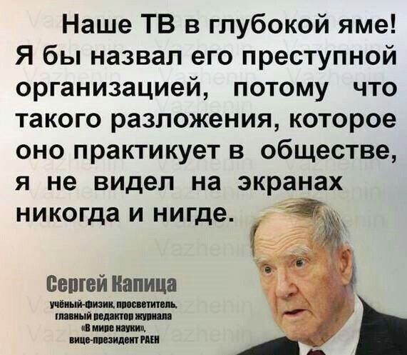 Полностью согласна с Сергеем Капица, телевизор можно не включать. В новостях и кино (про разные "шоу" я вообще молчу) одна грязь, убийства и разврат. А посмотрите на наших "певичек", что они своим внешним видом пропагандируют?