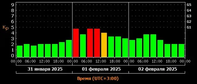 На 3 февраля 2025 года ожидается увеличение геомагнитной активности. Специалисты прогнозируют, что наивысший балл активности достигнет уровня 4 из 9, что соответствует малым геомагнитным возмущениям. Это состояние может повлиять на электрические сети, а также на работу систем связи и навигации и самочувствие людей..