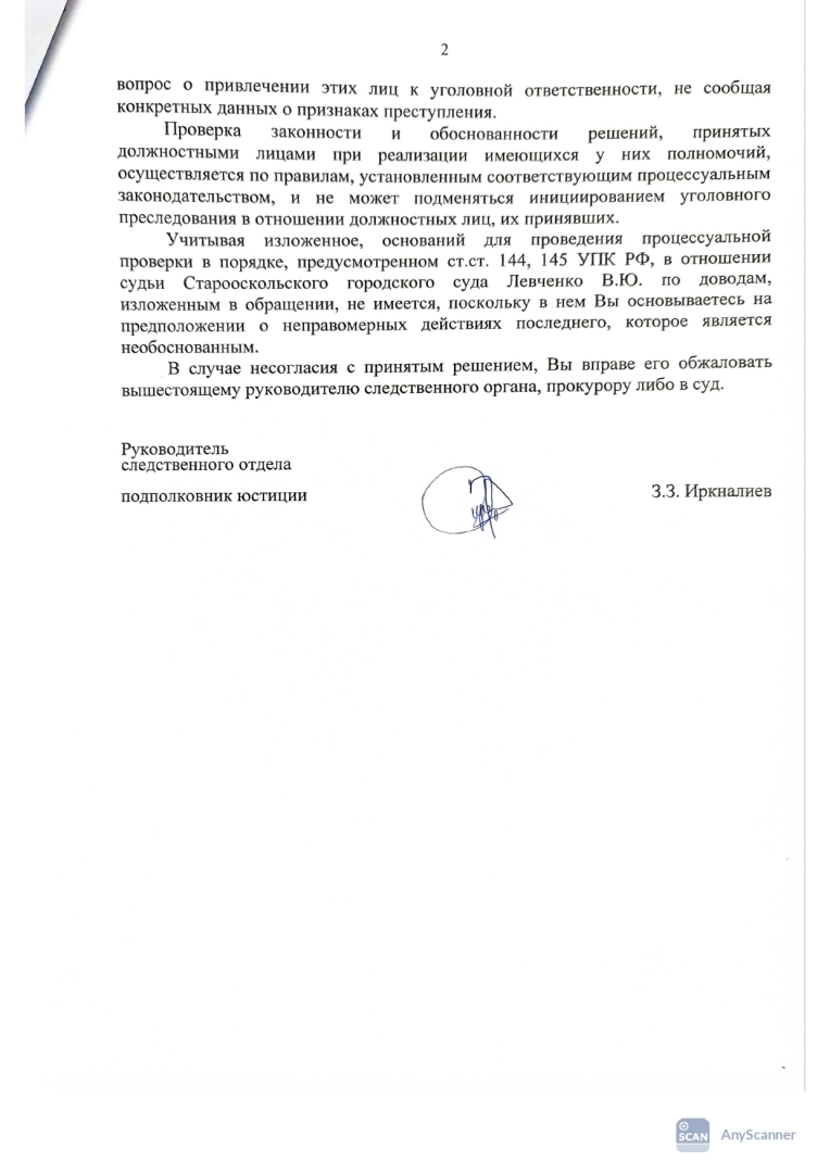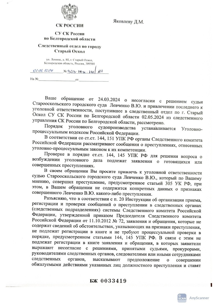24.03.2024 Я подавал заявление о привлечении к уголовной ответственности судьи Старооскольского городского суда левченко в.ю.
