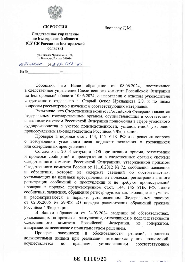 01.06.2024 иркналиев (ск рф по г. Старому Осколу) вынес отписку об отказе в рассмотрении моего заявления.