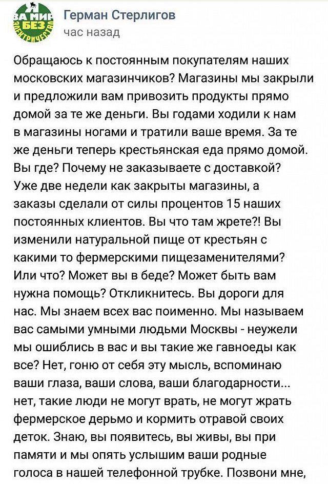 Главной целью своей жизни Стерлигов сделал заботу о здоровье россиян и самоотверженно кормит их настоящими «крестьянскими продуктами». Продолжая насаждать обволакивающую и трепетную опеку, Герман закрыл свои магазины в Москве и предложил доставку своих чудесных продуктов прямо на дом по тем же копеечным ценам. Но неблагодарные люди тупо игнорировали эту любовь.