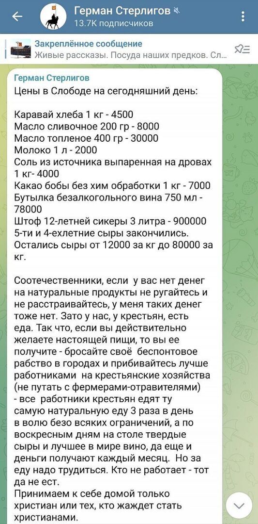 Герман Стерлигов не только мило напомнил о своих демократических ценах, но и позаботился об единичных голодранцах и нищебродах, гостеприимно пригласив их работать на свои плантации за еду. Человечище!