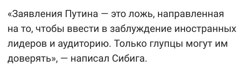 Например, глава МИД Украины Андрей Сибига выплеснул свое глупое мнение на слова Владимир Путина и назвал их абсурдными. Однако, в чем абсурд, он мудро и в соответствии с тем же законом Украины пояснить не смог, то есть опровергнуть заявление лидера России.