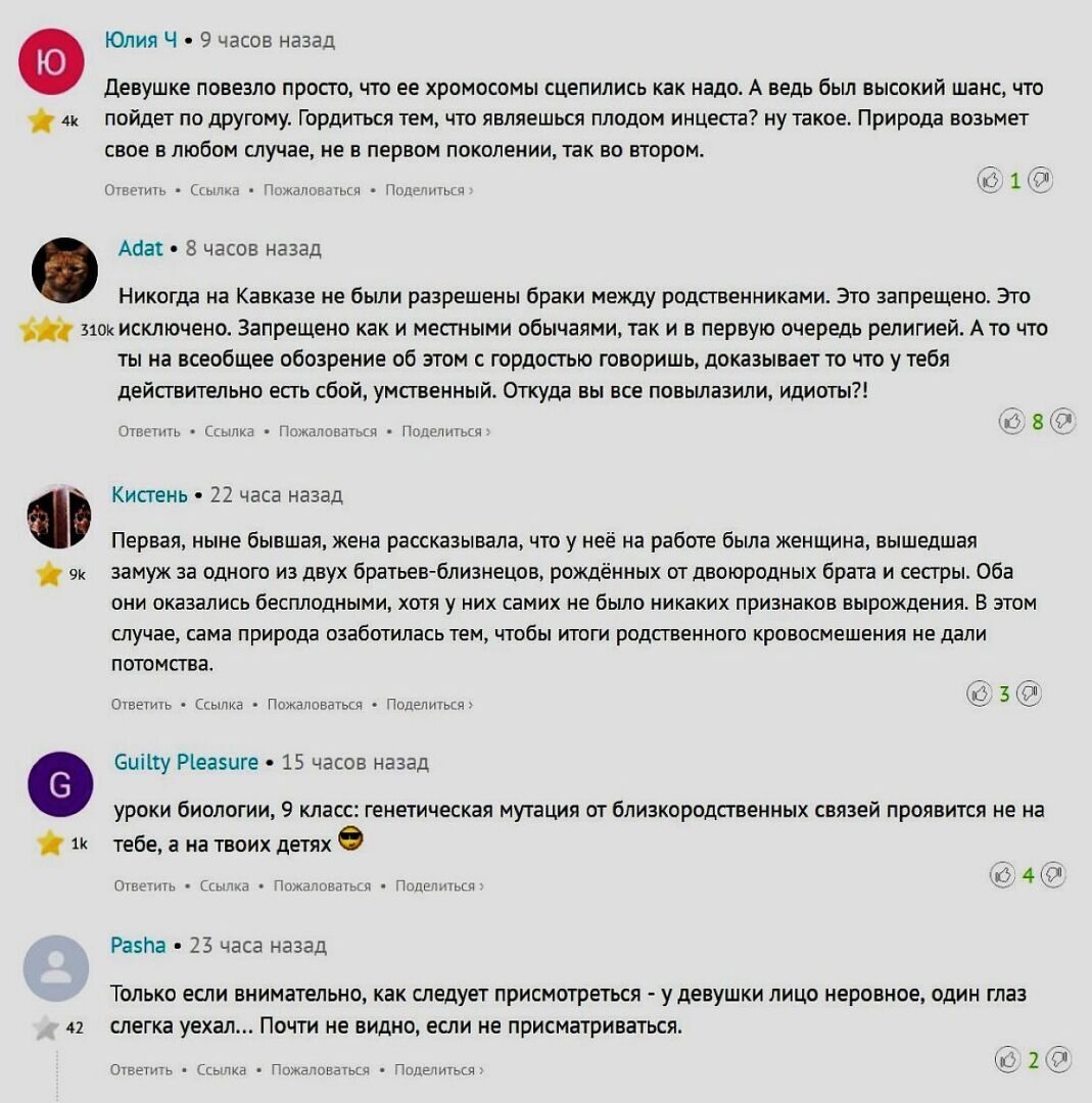 Пользователи Сети чрезвычайно критически отнеслись к этому выступлению и, если опустить едкие комментарии о тоннах силикона, которые обнаружили у девушки самые глазастые наблюдатели, то основное направление осуждения направлено на научную доказанность вреда инцеста, который может шарахнуть по башке даже через несколько поколений.