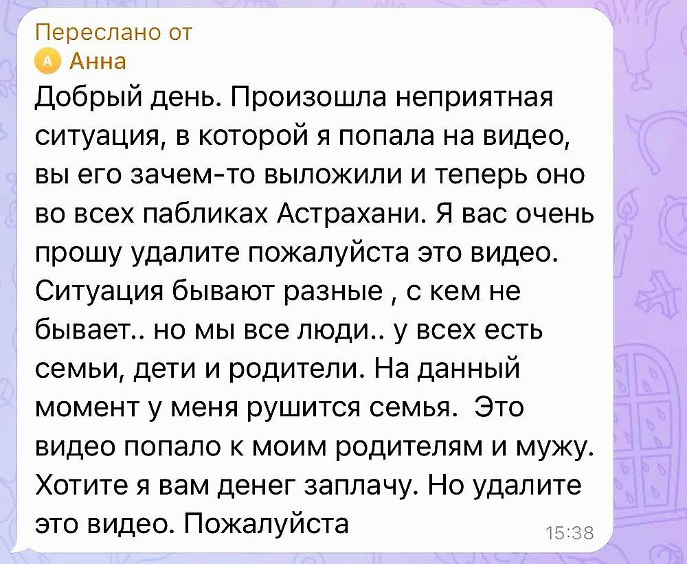 «Голенькие» видео мгновенно завирусились в местных социальных сетях и популярная «актриса» схватилась за голову. Она написала в телеграм-канал «Жесть Астрахань» и попросила удалить ролики, даже обещая за это деньги.