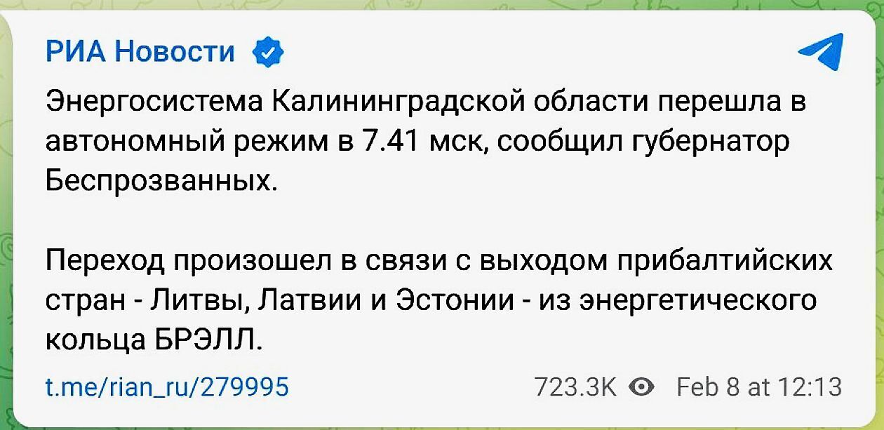 Как сообщил губернатор Беспрозванных, Калининградская область перешла в автономный режим электроснабжения. Прощай Прибалтика!