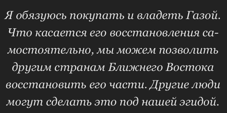 Хочу напомнить о его ранних заявлениях, когда он предлагал поменять место проживания жителям Сектора Газа на Египет или Иорданию. Но при этом, Трамп считает, что Катар или Саудовская Аравия должны заняться восстановлением, так как якобы у них достаточно на это денежных средств.