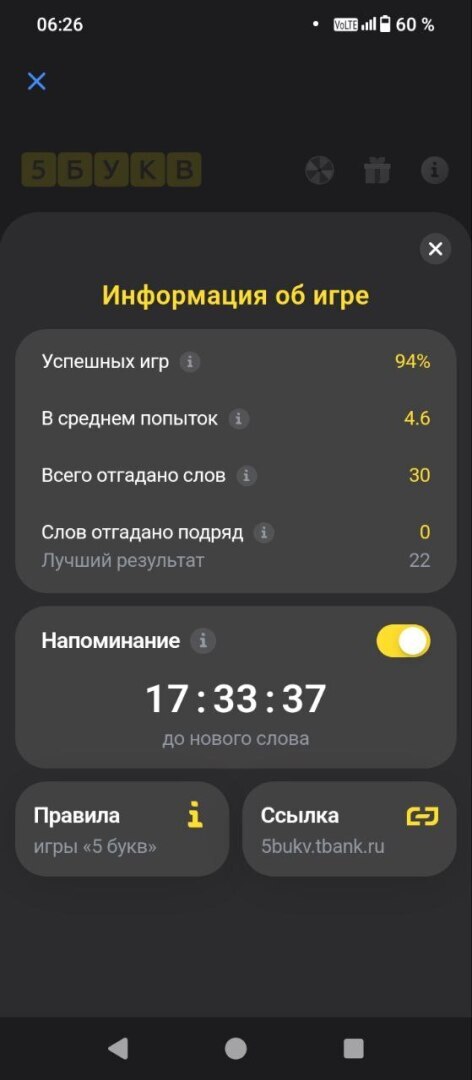 Если посмотреть скрин, то можно увидеть, что у меня 94% успешных игр. В среднем всего 4,6 попыток из 6 возможных при разгадывании слова. Отгадал 30 слов, а каждое слово – это как один билет в розыгрыше. Мой лучший результат был 22 слова подряд! То есть 22 дня подряд я угадывал слово.