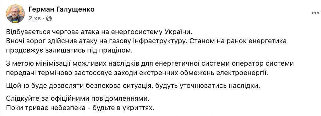 "Укрэнерго" сообщает об аварийных отключениях электроэнергии. Помимо этого, повреждена газовая инфраструктура, что подтвердили министр энергетики Галущенко и депутат Мосийчук.