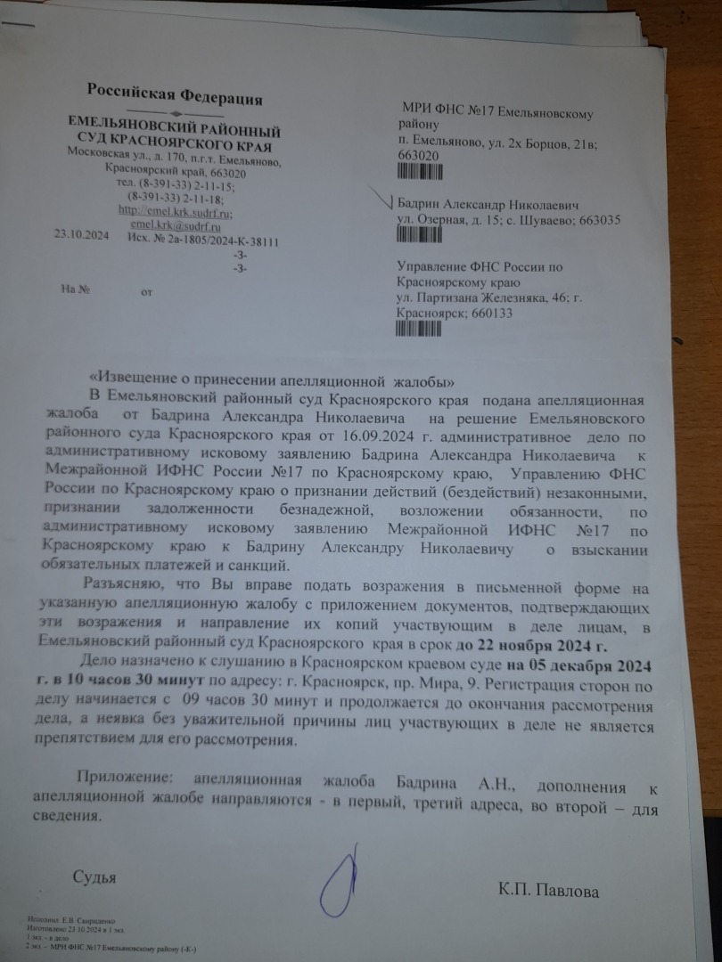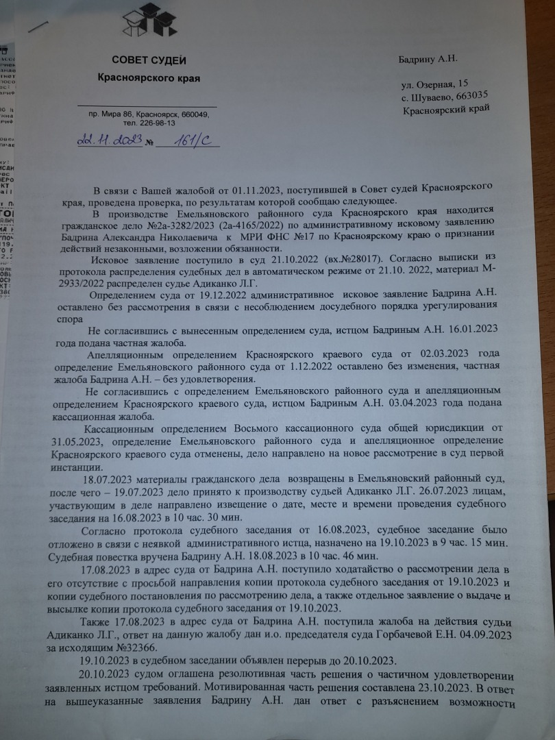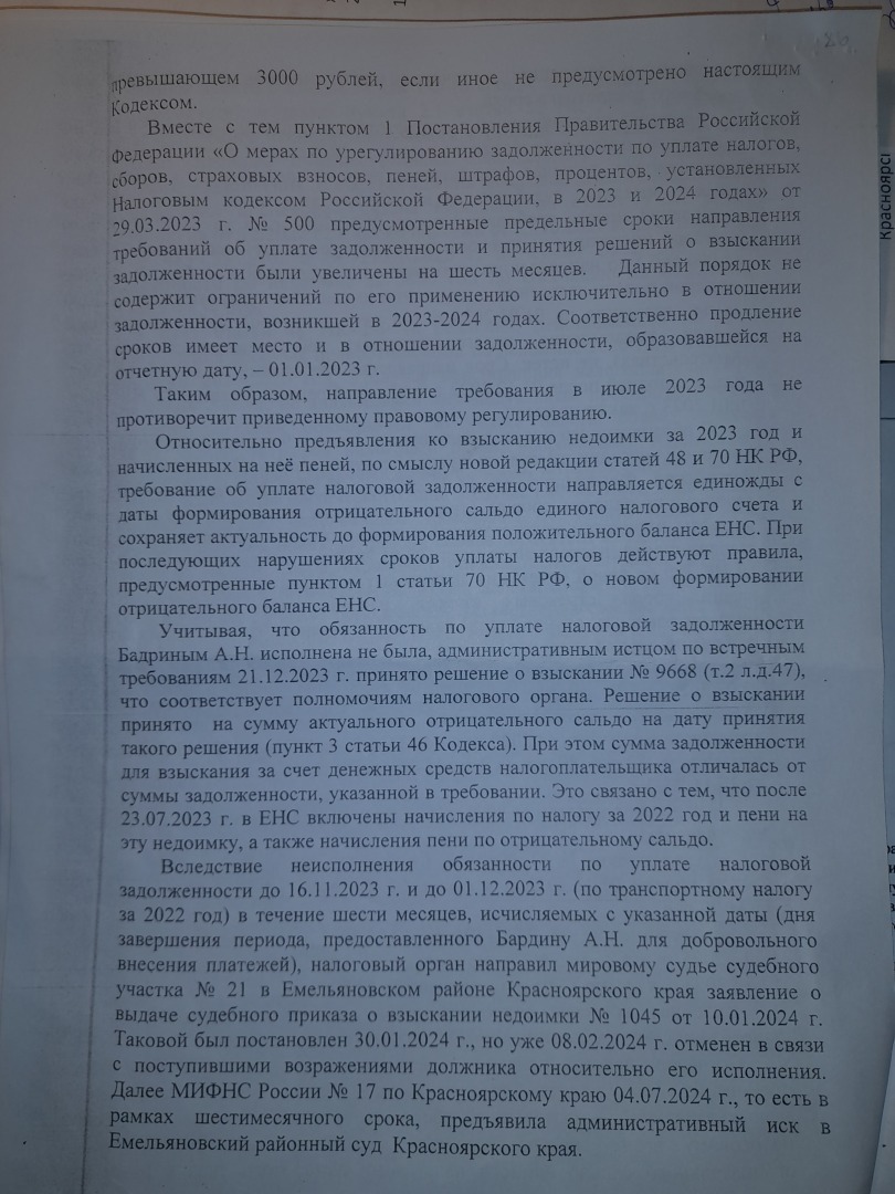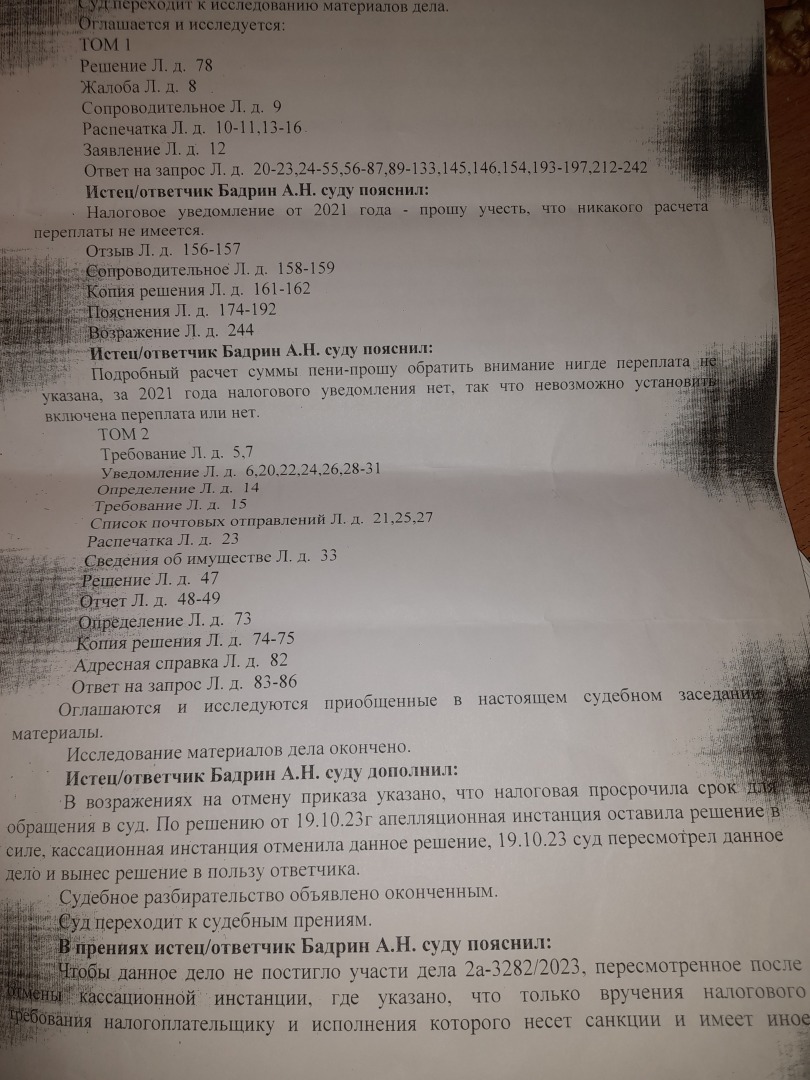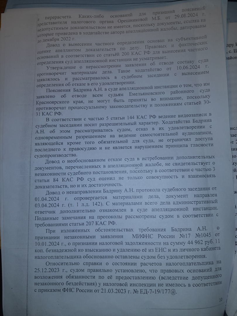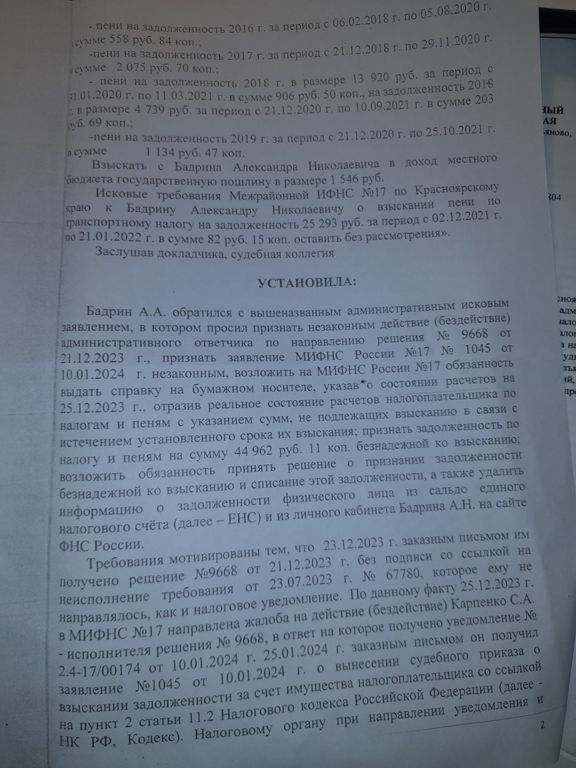 но эти расчеты на данную дату никак невозможно привязать к дате вынесения решения 20.10.2023 года, а чтобы прикрыть свой "зад" налоговая еще не то "нарисует".Но самое основное я понимаю , что Павловой К.П. плевать на своего коллегу по судейству Адиканко Л.Г., но коллегия Красноярского краевого суда в составе Мирончика И.С.,Штея Н.А., Ковалевой Т.В. плюнула на судейство вышестоящей инстанции - Восьмого кассационного суда общей юрисдикции, так как дело № 2а-3282/2023 - это результат пересмотра после отмены кассационной инстанцией