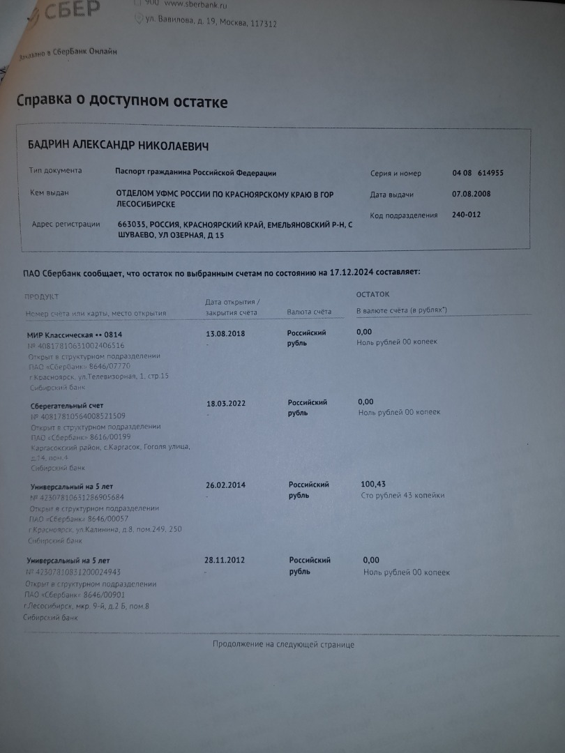 Александр Николаевич, а зачем вы выложили выписку из банка (справка о доступном остатке), не замазав все Ваши паспортные данные? Вы полагаете, что на этом сайте нет мошенников?
