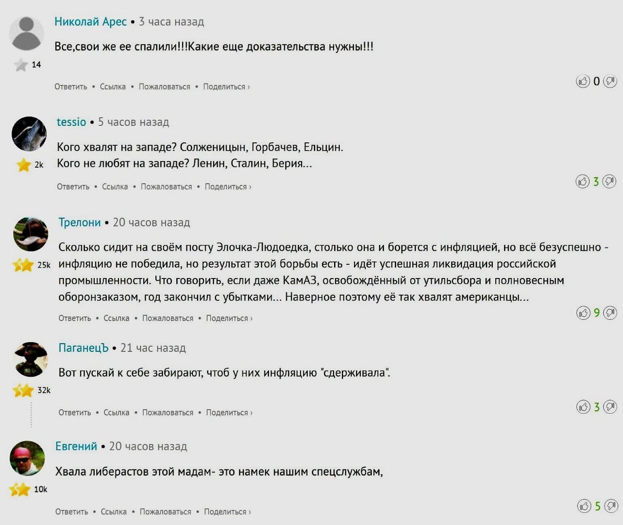 Так ещё раз спрошу, каким образом и кому , может аукнутся комментарий, о том что если Набиулину хвалит враг, ей должны заинтересоваться соответствующие органы? Набиулиной что-то аукнится, нет, мне, каким образом. В смысле, ты вообще о чём Валерий? Какие письма....