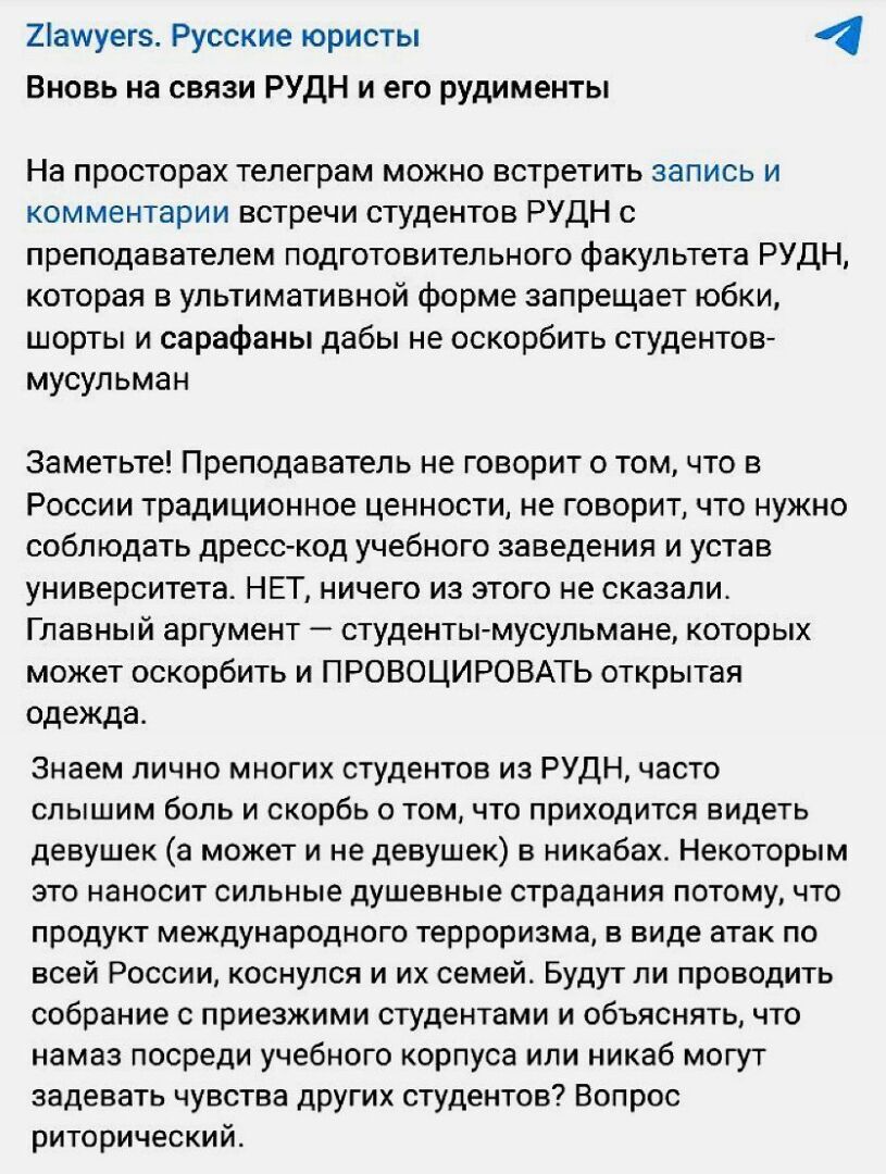 Эта воспитательная беседа вызвала целый шквал бурных эмоций в Сети, но хочется привести часть поста телеграм-канала «Zlawyers. Русские юристы», который высказал общее мнение аргументированно и культурно: