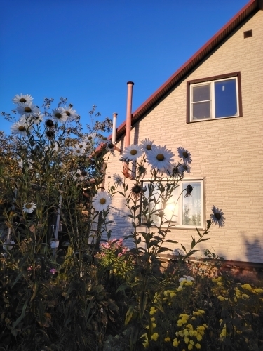 Вот такая ромашка растет у меня на участке, высотой она около двух метров, цветет до самых морозов.