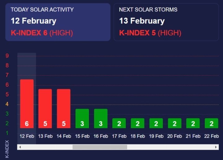 В четверг, 13 февраля, К-индекс составит в среднем 5 баллов, что считается уже настоящей магнитной бурей класса G1. С утра до вечера, с 12.00 до 18.00, сила геомагнитных ударов будет колебаться от 2 до 4 баллов, что характеризуется как возбужденная магнитосфера.