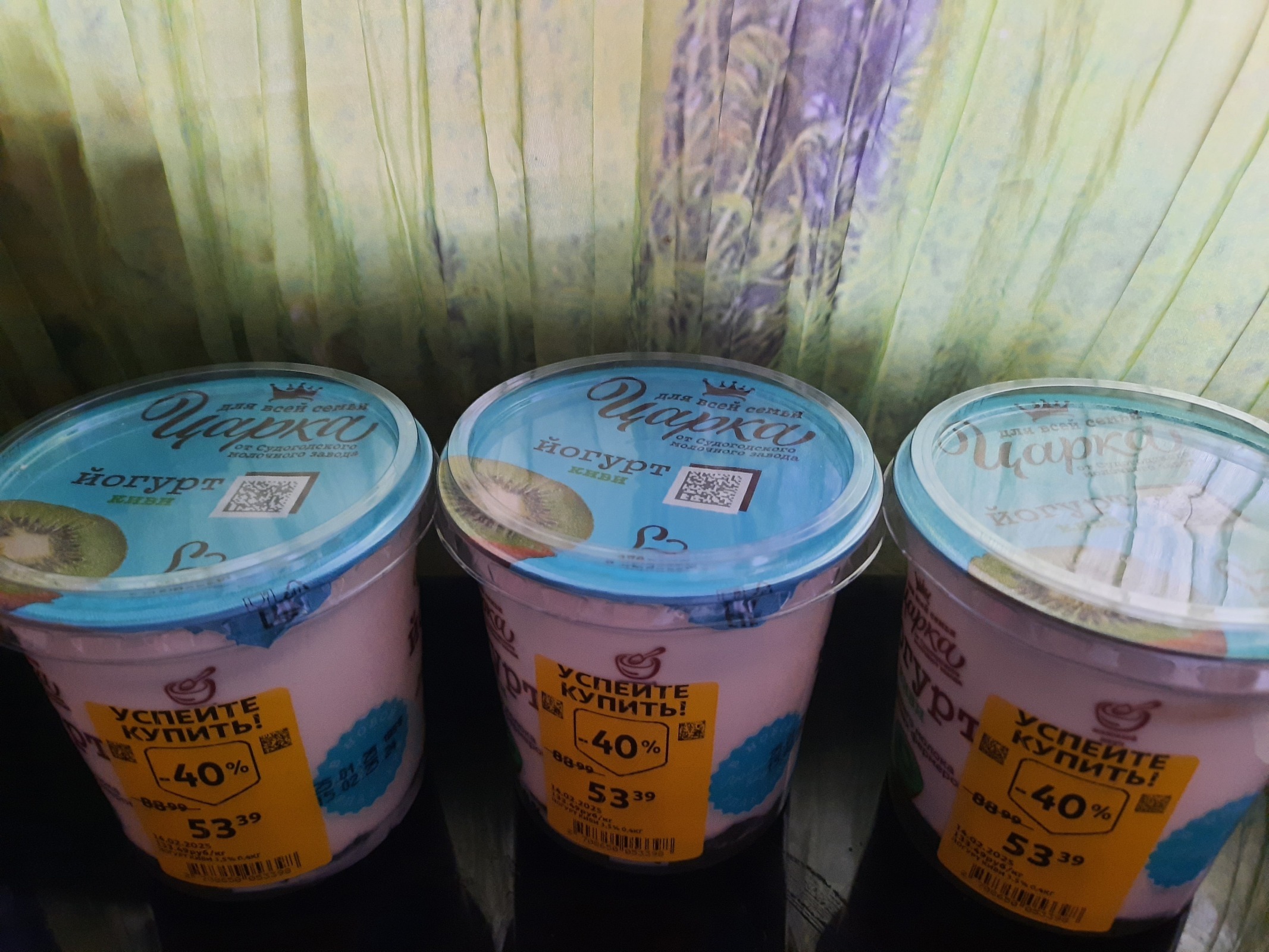 С утра выставляют продукцию с "жёлтыми ценами", то есть на 40% ниже, чем обычно. Удалось купить йогурт и ещё сыр, на него тоже была скидка.