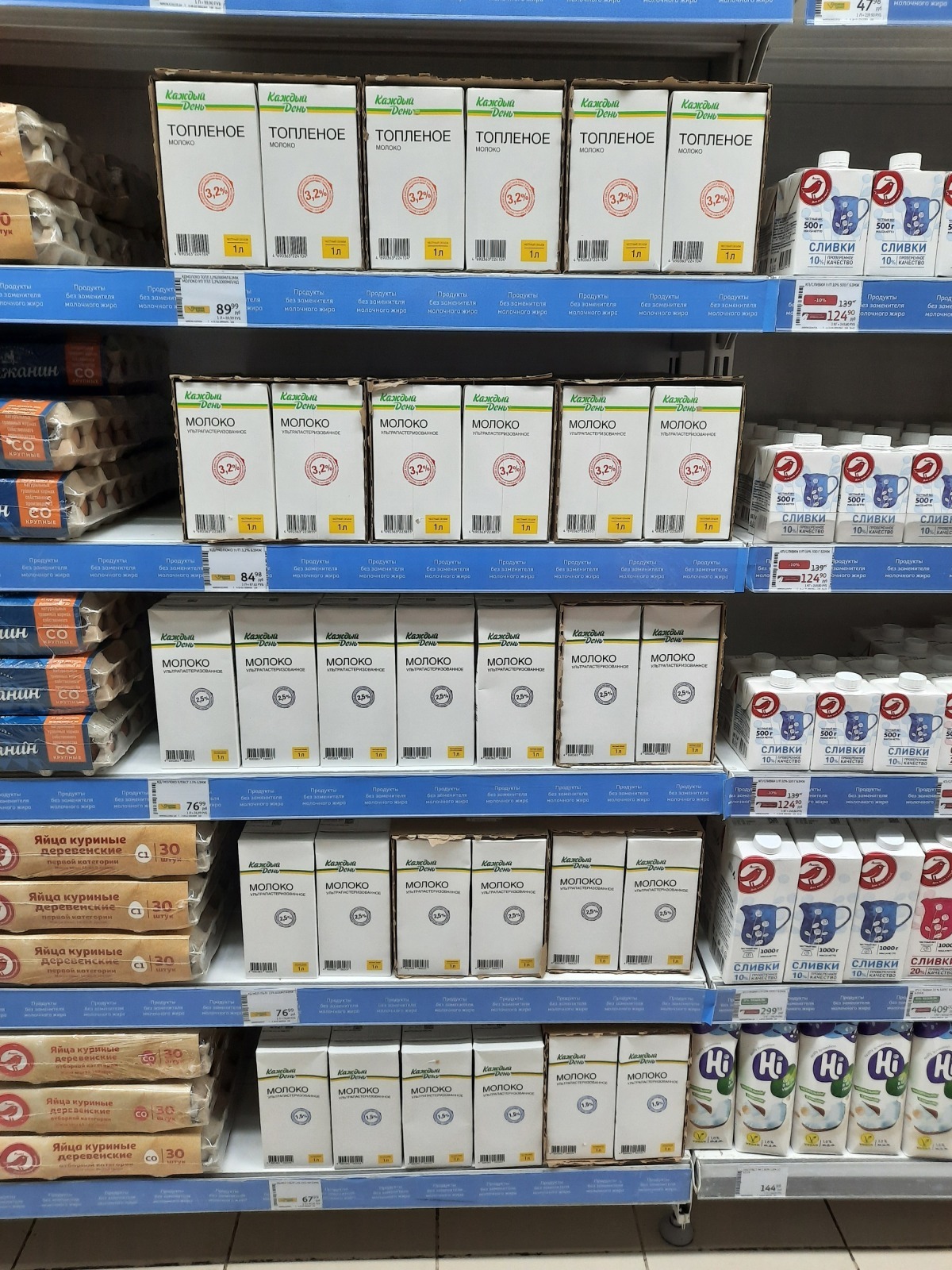 Молоко тоже в "Ашане" недорогое, по ценам в зависимости от жирности.