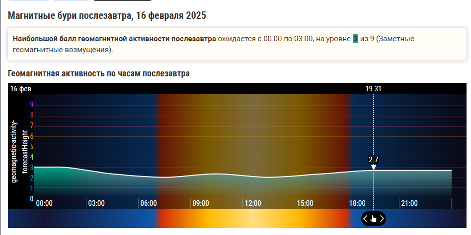 Согласно данным метеорологических служб, на 16 февраля 2025 года ожидается максимальный уровень геомагнитной активности с 00:00 по 03:00. В этот период уровень активности достигнет 3 из 9, что соответствует категории "Заметные геомагнитные возмущения". Это значит, что влияние магнитной бури ощутят не только метеорологи и исследователи, но и обычные люди.