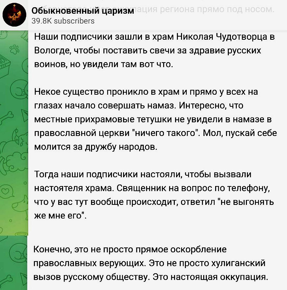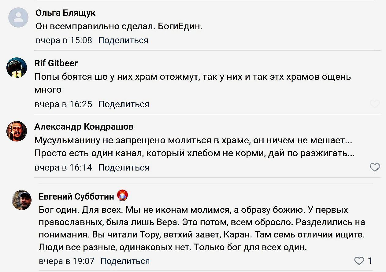 Раздутая провокация, тут частный, необычный, можно сказать неординарный случай. Не думаю что мусульмане массово начнут занимать православные молельные дома и храмы ⛪ Так-то официально в России объявляется что бог един. В зоне СВО на этом даже акцент ставится. Наша страна, наш общий дом, в состоянии крупнейшего вооружённого конфликта со времён второй мировой войны. Внешний враг силён и коварен, и не стоит на радость неприятелю, грызть друг другу глотки. Те кто раздувает конфликт внутри нашего общества будет нести за это ответственность, какой бы национальности он не был.
