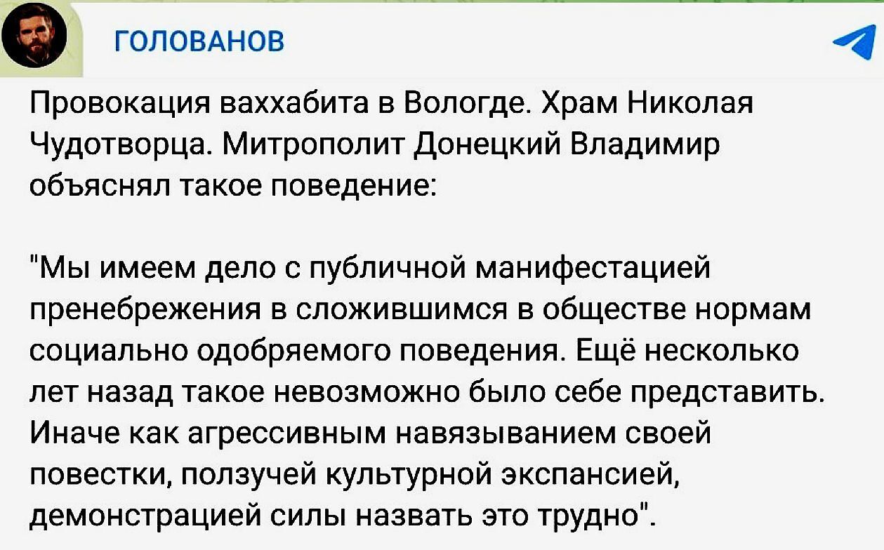 А блогер Роман Голованов процитировал мнение Митрополита Донецкого Владимира, объявив незваного гостя «ваххабитом».