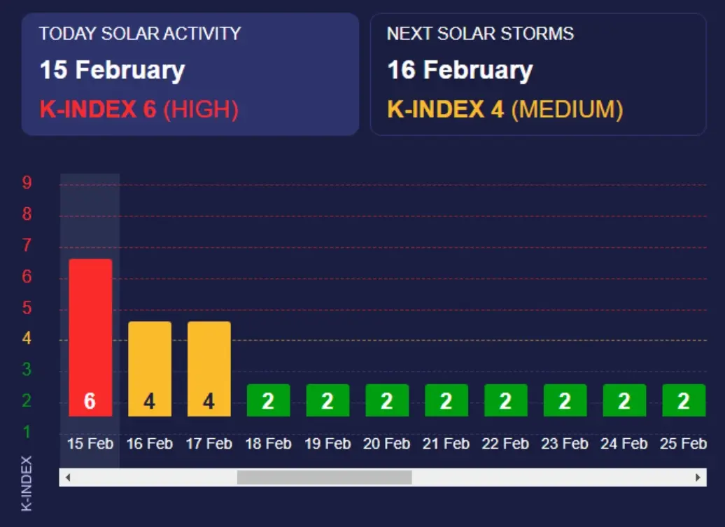 Однако, к вечеру 16 февраля магнитосфера может перейти в возбужденное состояние. По прогнозам, после 18 часов по московскому времени, Кp-индекс — индекс, классифицирующий геомагнитную активность — может достичь 4 баллов. Это состояние может вызвать изменения в ощущениях у людей, чувствительных к геомагнитной активности.