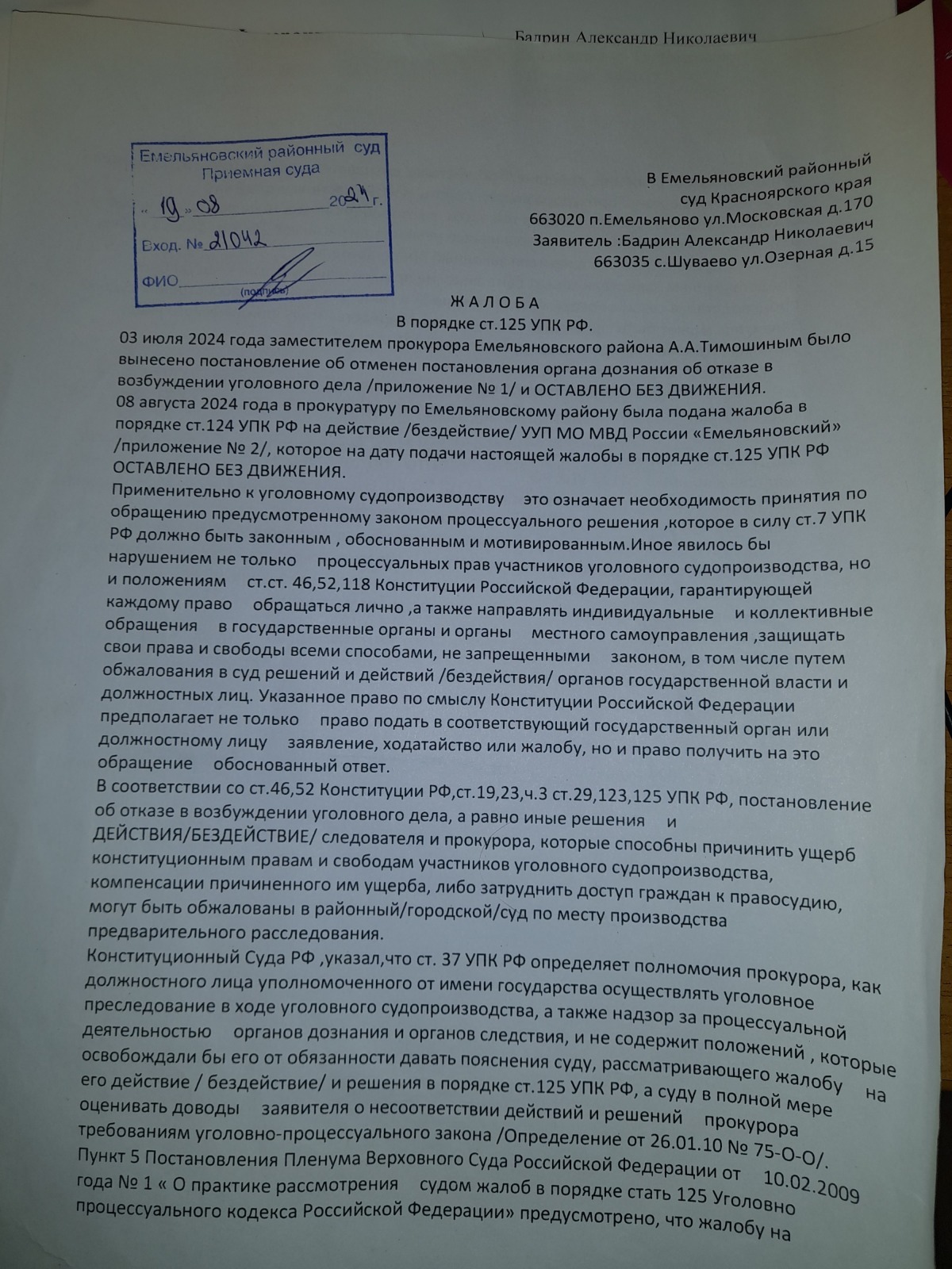 Господин Бадрин, статьей 124 УПК установлен порядок рассмотрения жалоб на действия или бездействия дознавателя и т д. участниками уголовного производства, а так же иными лицами права которых затрагивает производство по ВОЗБУЖДЁННОМУ уголовному делу.