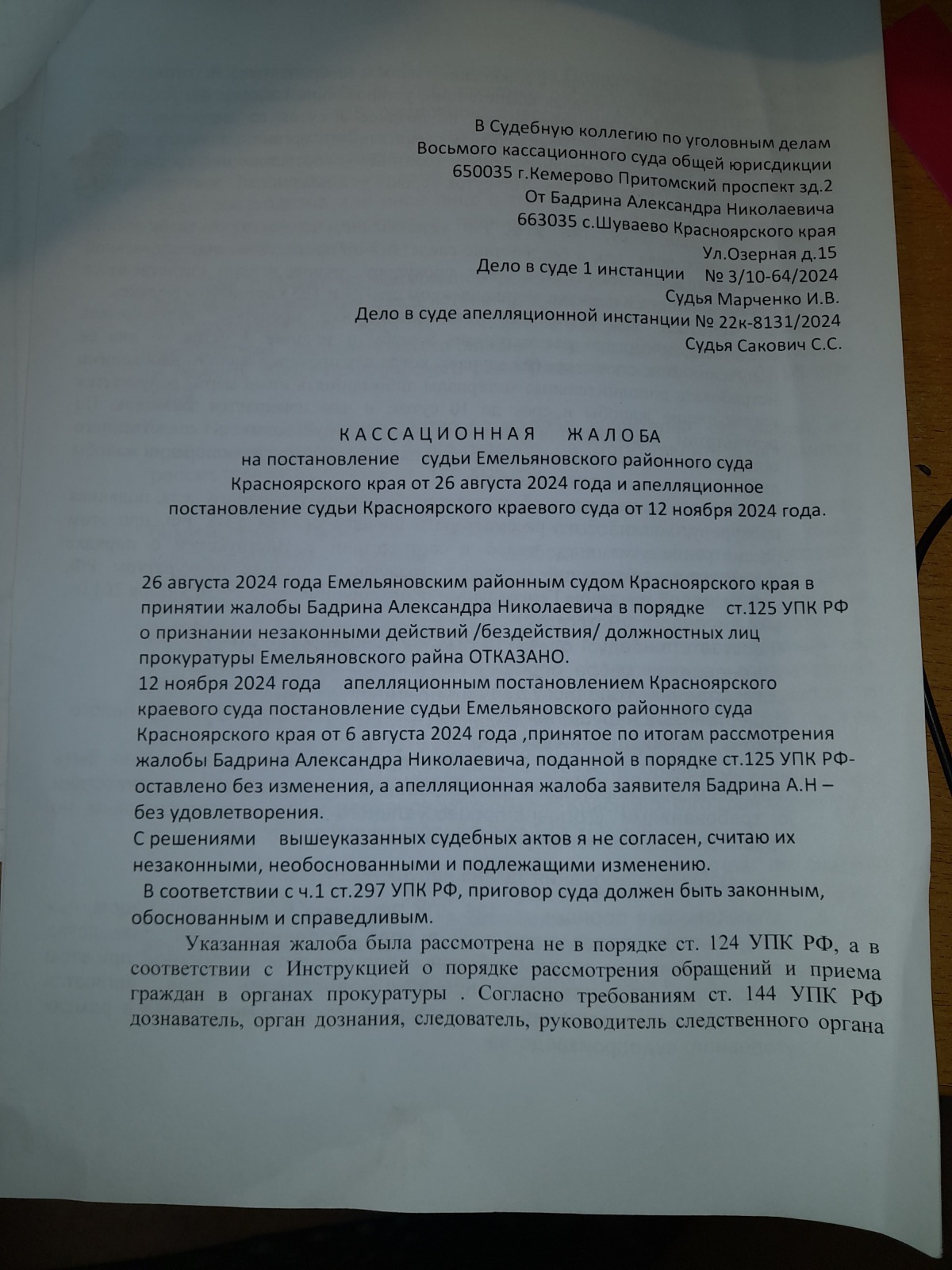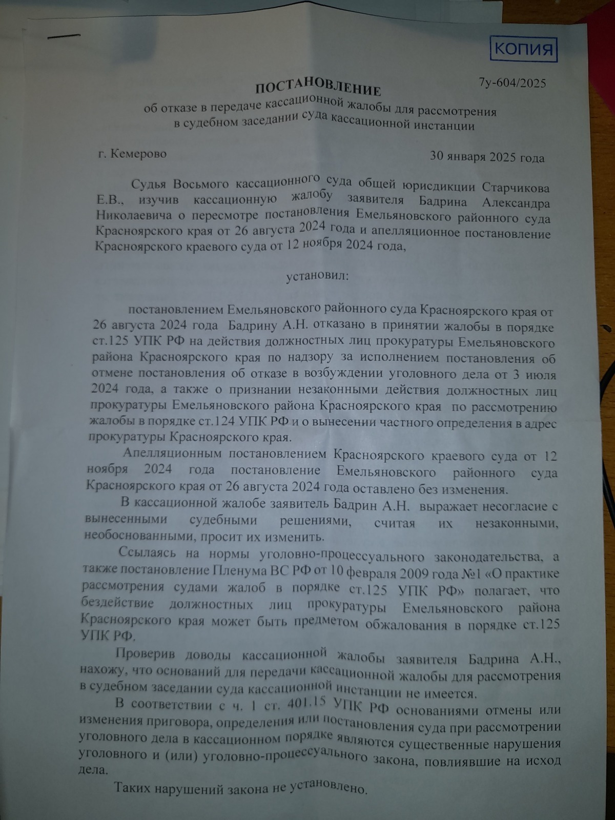 Добрый день . В связи с поступлением судебной корреспонденции из Восьмого кассационного суда общей юрисдикции решил поднять эту тему здесь.Когда бездействует следствие один из рычагов воздействия - это жалоба в порядке ст.124 УПК РФ в прокуратуру района.Вот Вам реально как рассматриваются такие жалобы