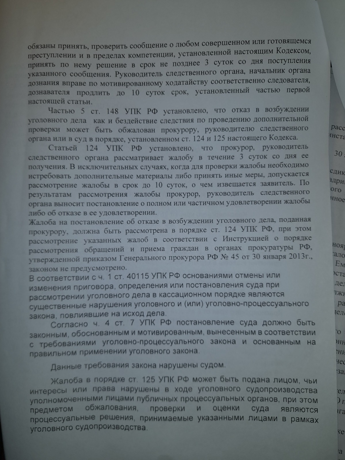 В Апелляционном определении Московского городского суда от 24 декабря 2014 г. по делу № 33-41946/14 указано: «…разрешая спор по существу и удовлетворяя требования заявителя, суд правильно руководствовался тем, что жалоба на постановление об отказе в возбуждении уголовного дела, поданная прокурору, должна быть рассмотрена в порядке ст. 124 УПК РФ, при этом рассмотрение указанных жалоб в соответствии с Инструкцией о порядке рассмотрения обращений и приема граждан в органах прокуратуры Российской Федерации, утвержденной Приказом Генерального прокурора РФ № 45 от 30 января 2013 г., законом не предусмотрено. Судебная коллегия соглашается с выводами суда первой инстанции, поскольку рассмотрение жалобы заявителя на постановление об отказе в возбуждении уголовного дела в соответствии с Инструкцией о порядке рассмотрения обращений и приема граждан в органах прокуратуры Российской Федерации является незаконным и противоречит требованиям ч. 5 ст. 148 и ст. 124 УПК РФ».