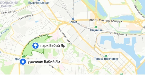 К древней Кирилловской церкви в урочище Дорогожичи (там расположен Бабий яр) ведёт проспект Степана Бандеры (Московский проспект Киева разделен на два - Романа Шухевича - садиста и палача и Степена Бандеры - садиста и извращенца), переходящий в улицу Елены Телиги - бандеровки и националистки. Прямо к Бабьему яру и к памятнику Жертвам холокоста выводит улица Олега Ольжича - агента абвера и украинского националиста. По этой улице вели на расстрел в Бабий Яр узников концлагеря - пленных бойцов РККА во все годы Великой Войны