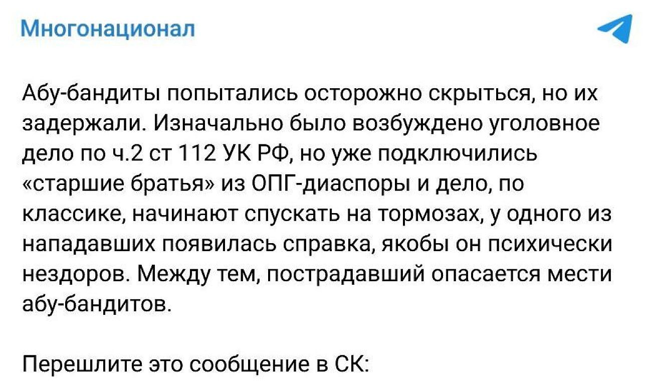 После инцидента телеграм-канал «Многонационал» сделал такое заявление:
