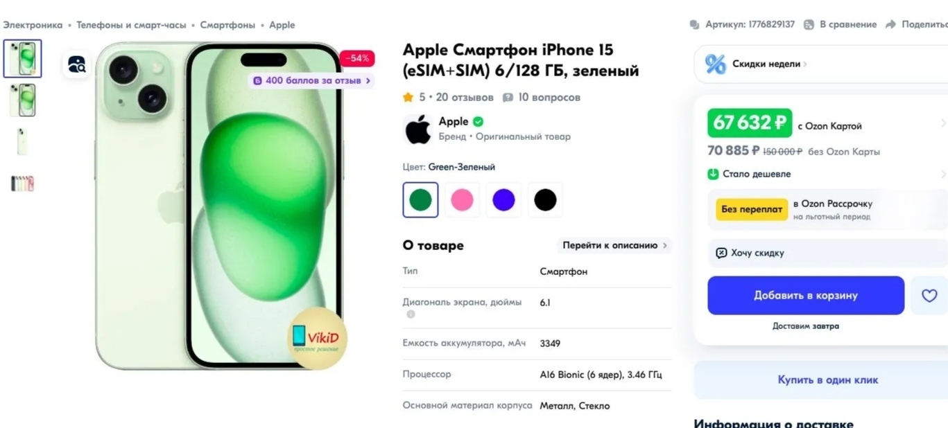 Сразу после выпуска в 2023 году российские ретейлеры предлагали iPhone 15 по цене от 125 тысяч рублей. На маркетплейсах сейчас можно найти такой смартфон за 63 тыс. рублей, тогда как в январе средняя цена составляла 75 тысяч.