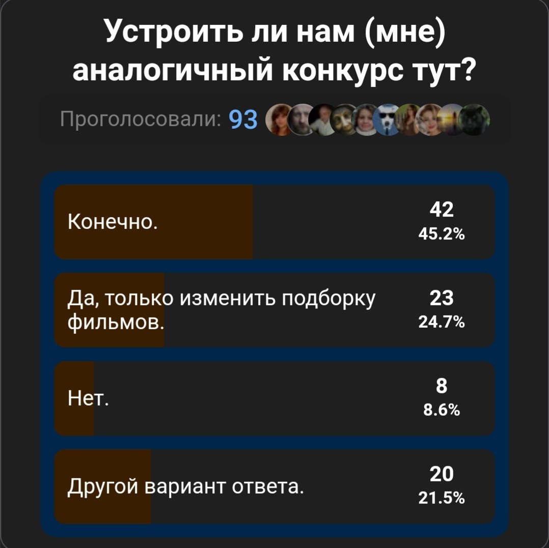Доброе время суток дамы и господа! Сегодня уже три дня прошло от финала конкурса (на предыдущую мою статью от 17.02.2025 года). Результаты опроса видно из моего скриншота. За "аналогичный конкурс на этом сайте" проголосовало 42 пользователя; "изменить подборку фильмов" отдали голоса 23 участника сайта. Вариант "нет" 8 пользователей выбрало между прочим. Большинство "за" и это уже хорошо! Поехали!
