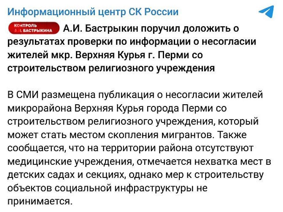 А так же, Глава СК рекомендовал уделить внимание на отсутствие в Верхней Курье медицинских учреждений, нехватки мест в детских садах, секциях и прочих социальных объектах, которые по сравнению со строительством мечети мало что значат для местных властей.