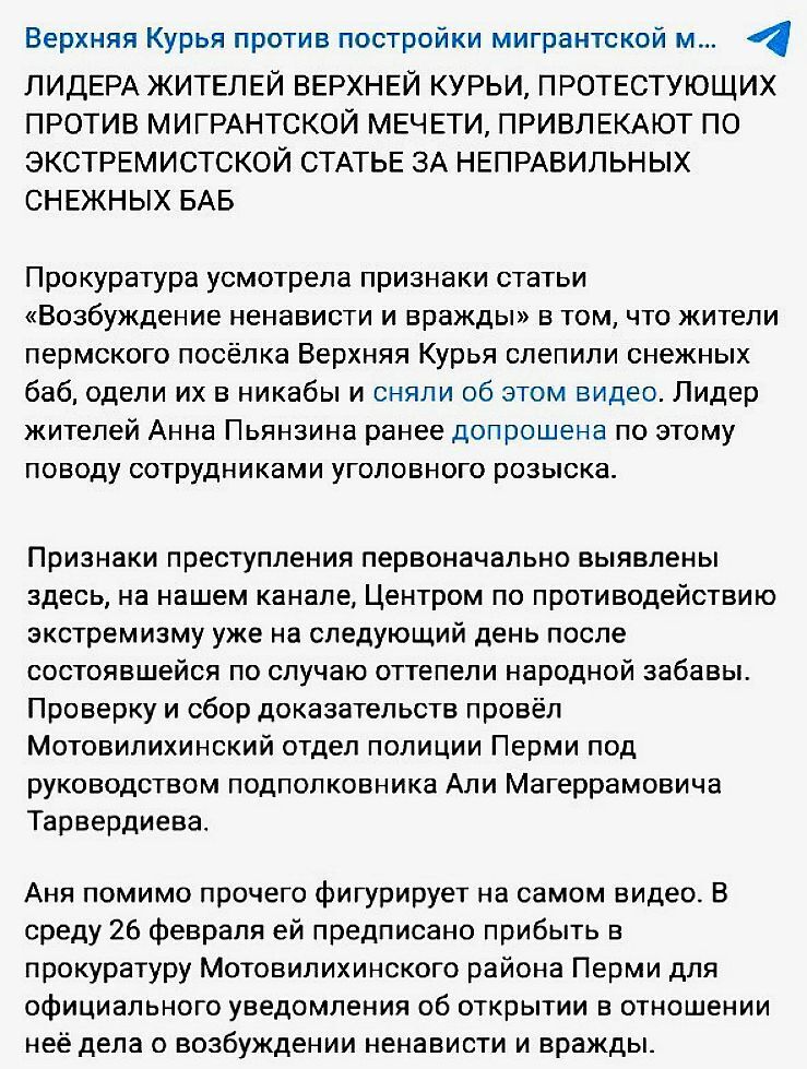 Телеграмм канал «Верхняя Курья против постройки мигрантской мечети», специально созданный по этому поводу, поблагодарил все участников - «Спасибо всем, кто не струсил и помог бабам самовыразиться!».