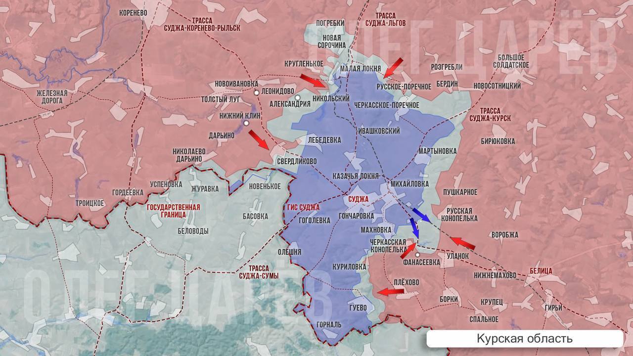 Наступление в приграничье. Российские войска ведут наступление в Курской области, в то время как украинские силы пытаются сдержать натиск. Зафиксирован прорыв границы в районе Николаево-Дарьино с продвижением в сторону Журавки, где идут встречные бои. ВСУ контратакуют из района Беловод.