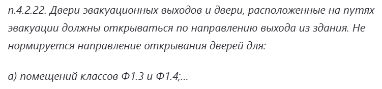 Также, если смотреть на ПНиП, дверь в квартиру в точном понятии не является путем эвакуации и к ней нет жёстких правил, ещё и с учётом того, что квартира является объектом, где одновременно находится не более 14 человек.