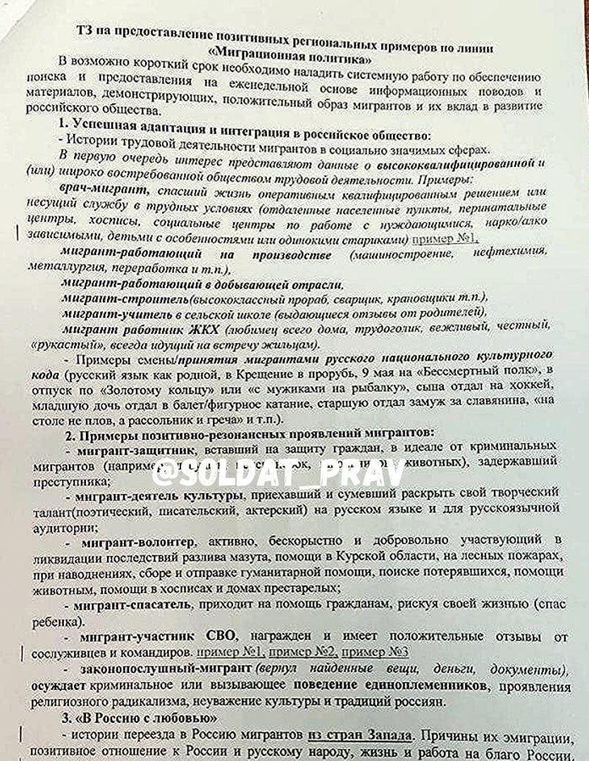 Дальше больше! Почитайте вот, какие в регионы РФ полетели разнарядки по формированию положительного образа мигрантов. В массовом сознании русского народа должны возникнуть светлые образы рукастого и безотказного "мигранта - работника ЖКХ" и "мигранта - участника СВО", которые постоянно приходят на помощь русским неумёхам, лентяям и трусам. После реализации данного комплекса мероприятий, любой местный житель должен настолько преисполниться благодарностью иностранным специалистам, что будет не замечать "мигранта - карманника" лезущего за кошельком в сумку к пенсионерке и "мигранта - насильника" пристающего к девушке или несовершеннолетним. На такую вот идиллию никаких денег им не жалко.