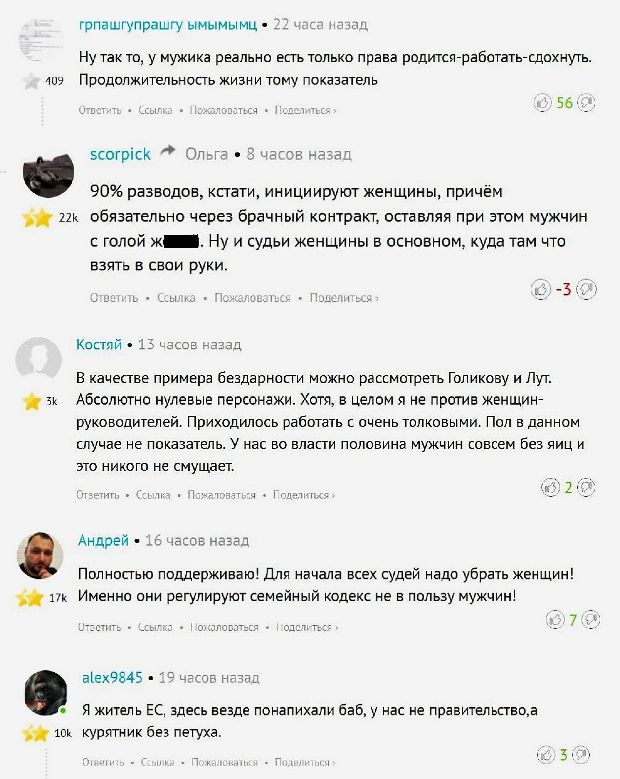 В ГД нового созыва из 450 депутатов 74 — женщины (это 16% всего состава). Если этого «пламенного борца за права мужчин практически единогласно поддержало мужское население Сети» и (не ошибусь) все мужчины ГД, то я могу сказать, что все они не блещут умом. «Равноправие между мужчиной и женщиной», как высказался Дмитрий Кузнецов, приведет к увеличению числа женщин в ГД от 16% до 50% (или я ошибаюсь?) И если большинство из нынешних депутаток такие, как мадам Арбидол, то, будь моя воля, я бы их всех немедленно убрала как можно дальше от кормушки, а не увеличивала бы их число до 50%. Что касается бабушки Матвиенко, то ее давно уже пора отправить на пенсию, т.к. 07.04.25 ей будет 76 лет (7 апр. 1949 г.) Мне же по жизни везло с начальниками: все были мужчинами (умными, порядочными...). Один раз, правда, начальницей временно была женщина...Это был кошмар! Поэтому я в опросе и нажала на ответ «Отрицательно». Хотя к умным руководительницам я отношусь очень даже положительно (но, к сожалению, такие мне в жизни не встречались). Хотя сейчас вспомнила Галину Старовойтову, но таких умниц, как она, в ГД нет и не будет. И последнее... Понравился комментарий в статье (скриншот): «В целом я не против женщин – руководителей. Приходилось работать с очень толковыми. Пол в данном случае не показатель. У нас во власти половина мужчин совсем без яиц, и это никого не смущает.» Отлично сказано! Скажу за себя, что смущает (и, думаю, не только меня), но исправить ЭТО нам не под силу. Так что, я за то, чтобы во власти было побольше адекватных, умных, честных, порядочных людей (а если говорить о мужчинах, то пусть они будут обязательно «с яйцами», а не пойми что).