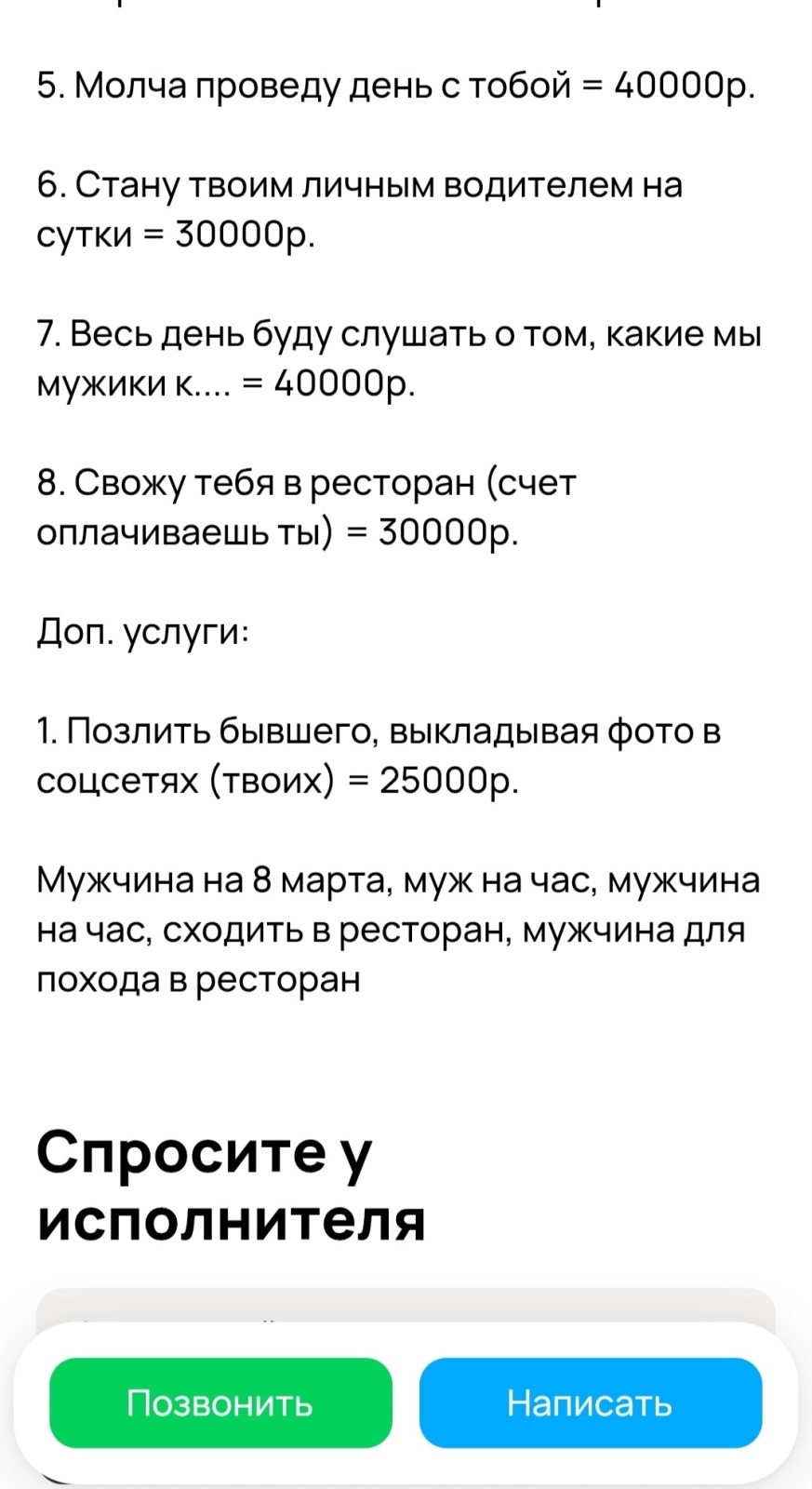Мужчина станет личным водителем для «второй половинки» и уедет с ней хоть на край света (шучу) всего за 30 000 руб. Или же, наоборот, останется дома и будет обсуждать с женщиной, какие все мужики к... нехорошие! Стоимость такой услуги – 40 000 руб.